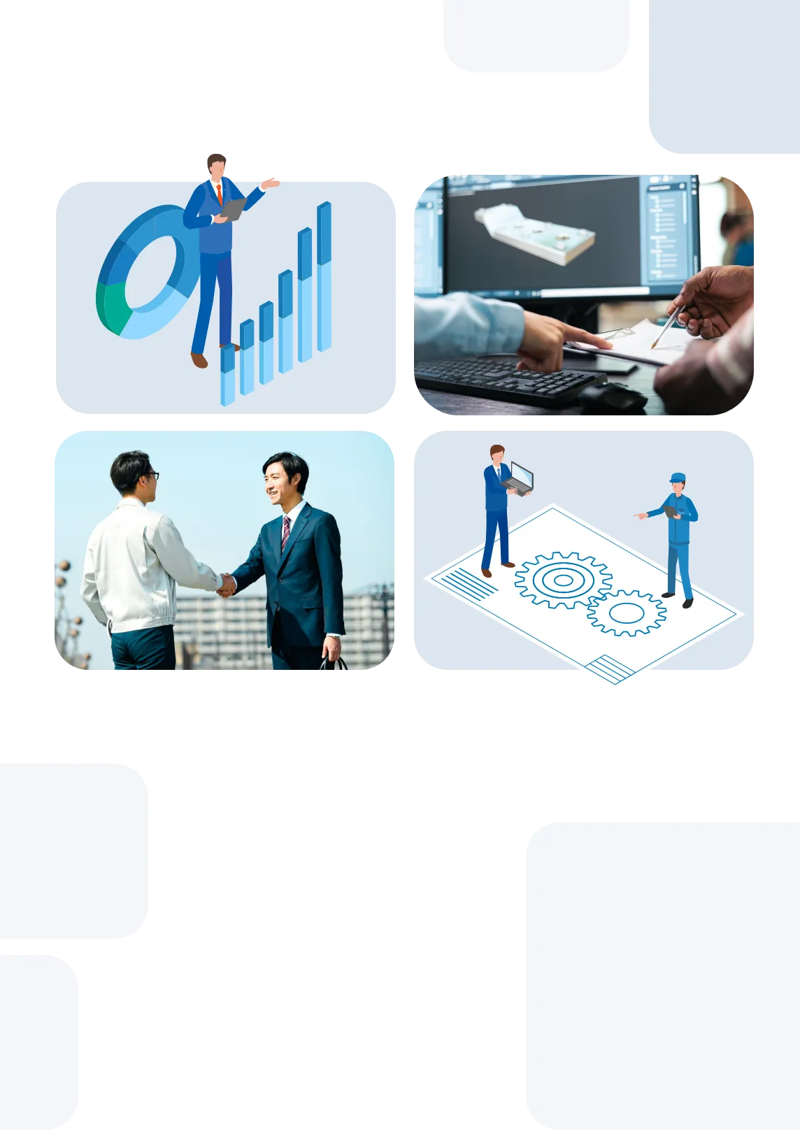 豊富な実務経験を基盤に、課題解決に向けた戦略立案から実行管理までを包括的に支援。ものづくり分野に精通したコンサルタントが多角的な視点で企業をサポートします。